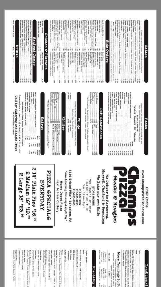 Located at 1336 Bristol Pike, Champs Pizza is committed to providing a delightful dining experience with good food, great company, and a welcoming atmosphere. Grab a slice or two today!